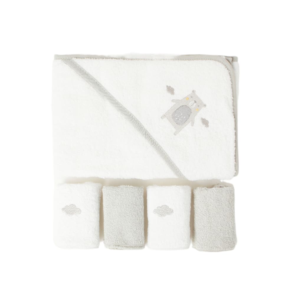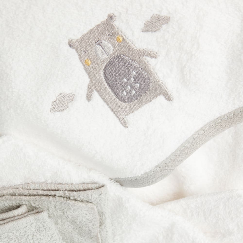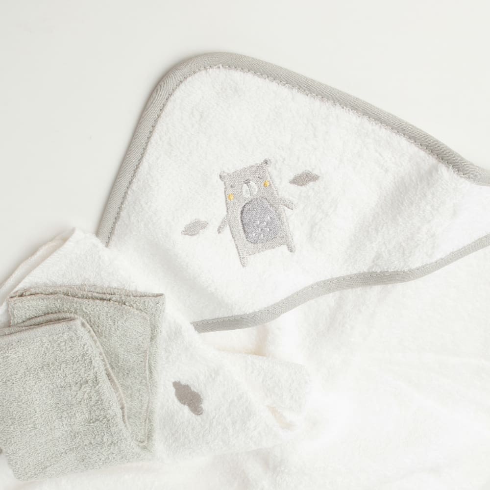 Wrap your little one up in comfort and style after bath time with our Snugtime Hooded Towel and 4 Piece Washer Set. Crafted from absorbent cotton towelling, this adorable towel features an embroidered pattern on the hood with contrast colour binding. Two of the washers feature a cute embroidery too. With a generous size of 80cm x 80cm for the towel and 30cm x 30cm for each of the washers, you’ll be able to keep your child dry and cosy.